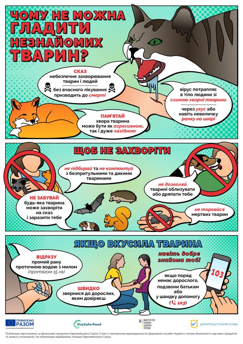 Детальніше – як потрапляє сказ в організм і що робити, якщо вас вкусила дика тварина – в інфографіці, розробленій спільно з європейським проєктом EU4SaferFood.