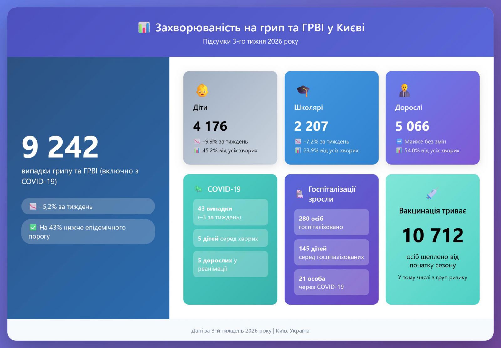 За минулий тиждень у столиці зафіксовано 9242 випадки грипу та ГРВІ (включно з COVID-19) — це на 5,2% МЕНШЕ, ніж тижнем раніше.