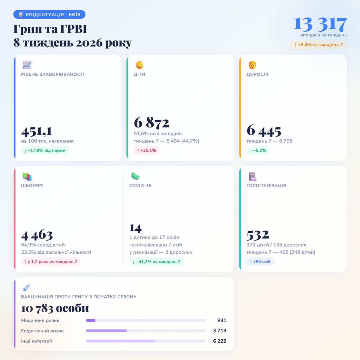 За 8 тиждень 2026 року в місті Київ зареєстровано 13 317 випадків грипу та ГРВІ, зокрема COVID-19 (минулого тижня — 12 290).