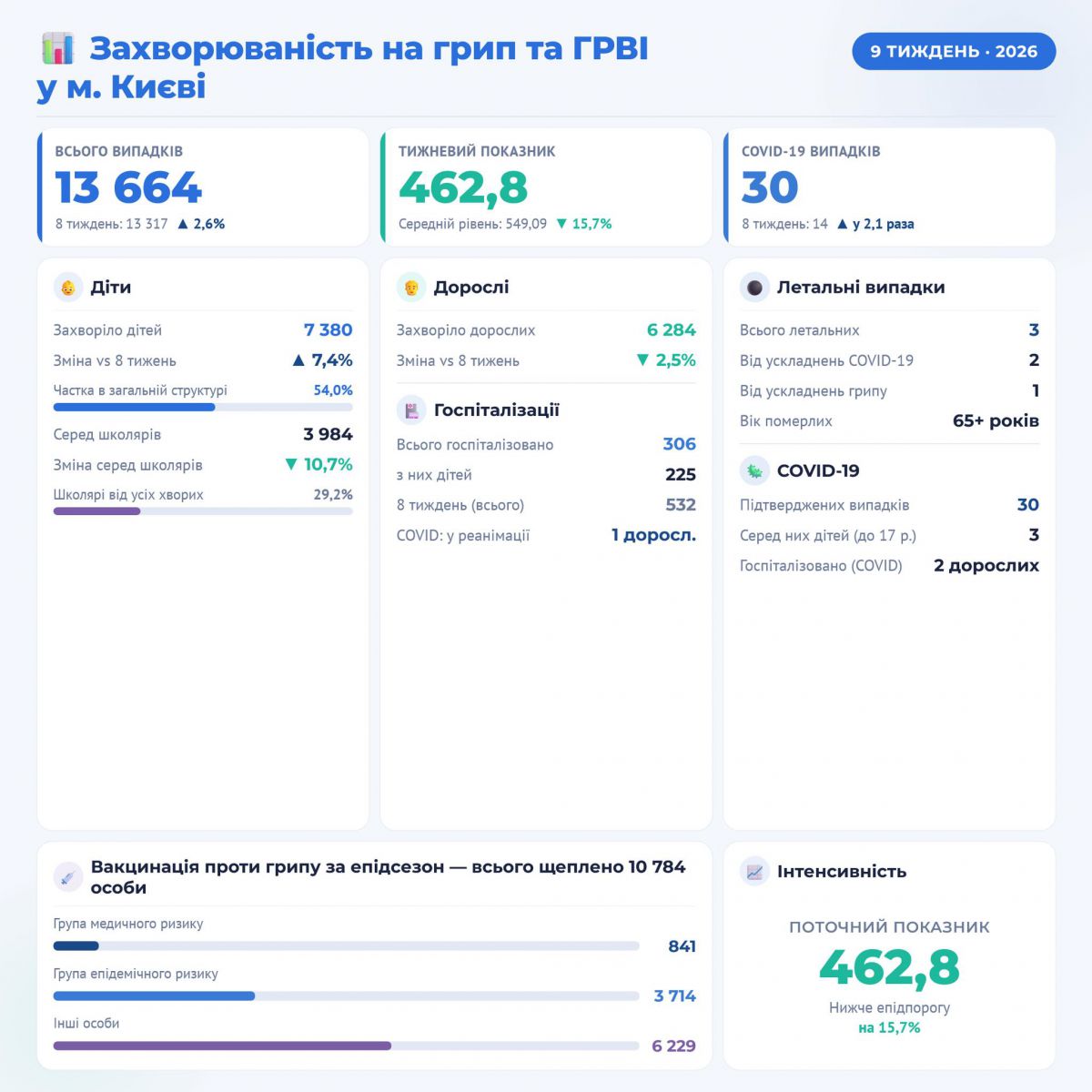 За звітний тиждень у Київ зареєстровано 13 664 випадки грипу та ГРВІ, включно з COVID-19 (8 тиждень — 13 317).