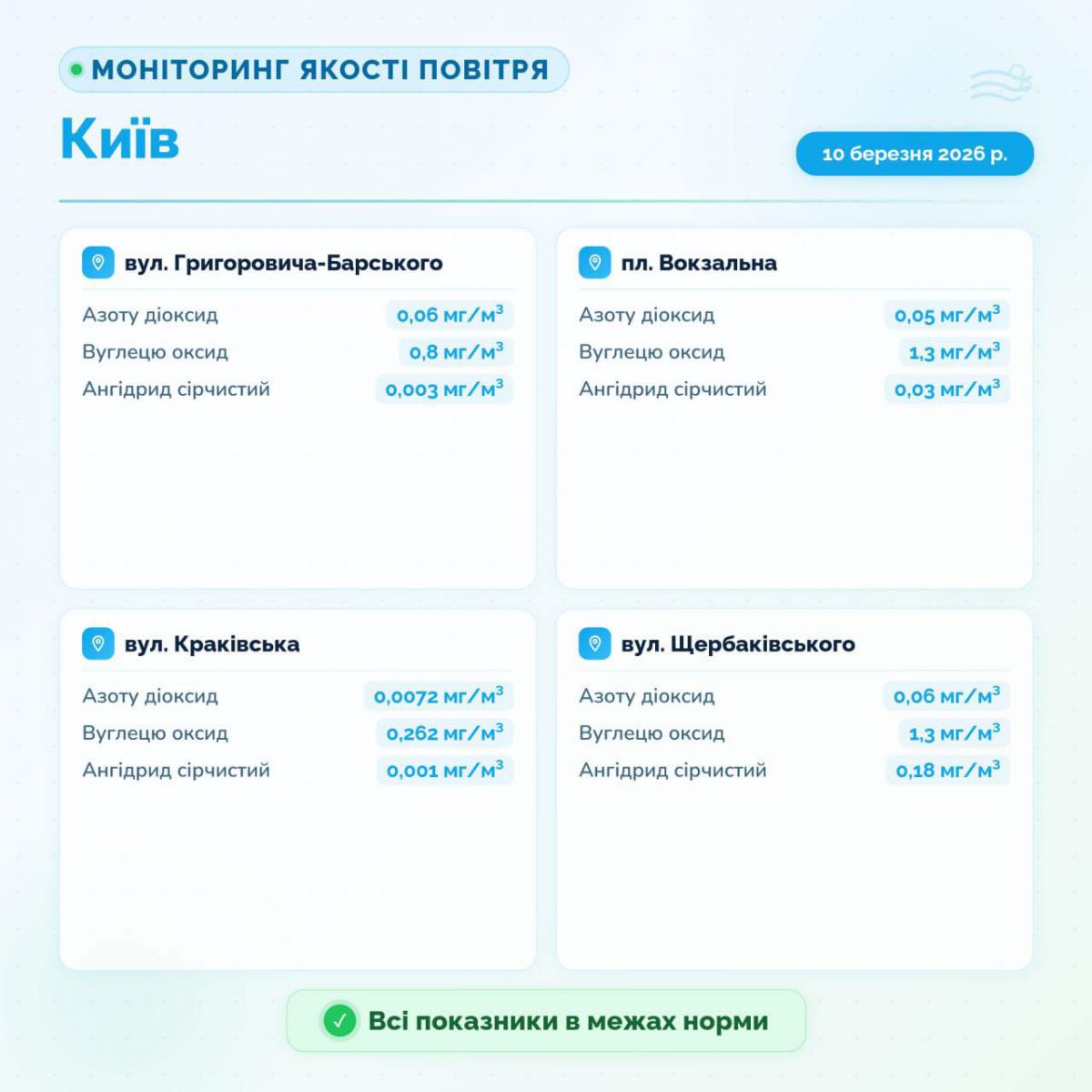 Станом на сьогодні перевищення граничнодопустимих максимально разових концентрацій (ГДК м.р.) шкідливих речовин (діоксид сірки, оксид вуглецю, діоксид азоту) в повітрі м. Києва не реєструвалися.