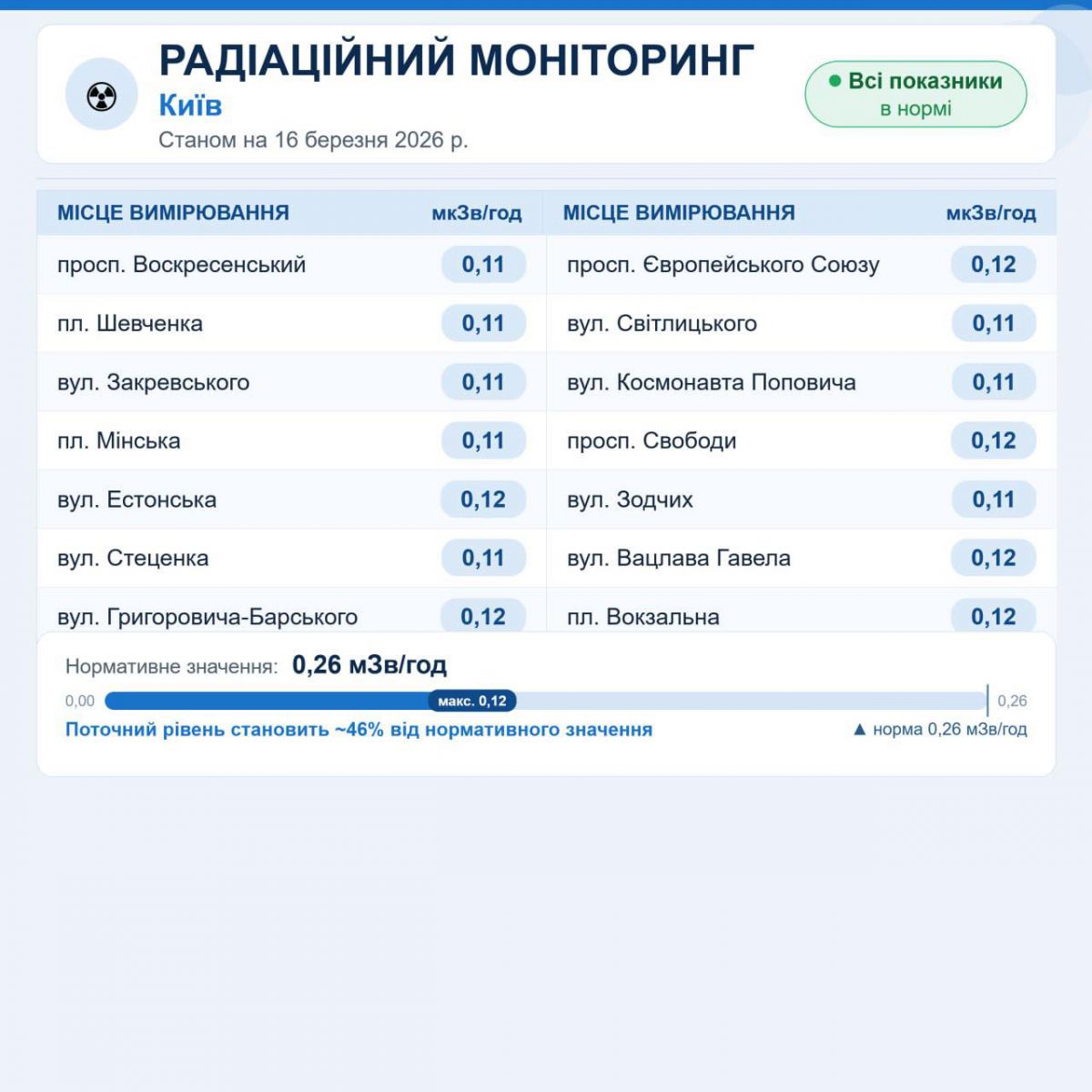 За результатами щоденного моніторингу радіаційного фону, який проводиться фахівцями ДУ "Київський міський центр контролю та профілактики хвороб Міністерства охорони здоров’я України" в реперних точках міста, гамма-фон у м. Києві не перевищує контрольні рівні м. Києва і знаходиться в межах природних фонових значень.