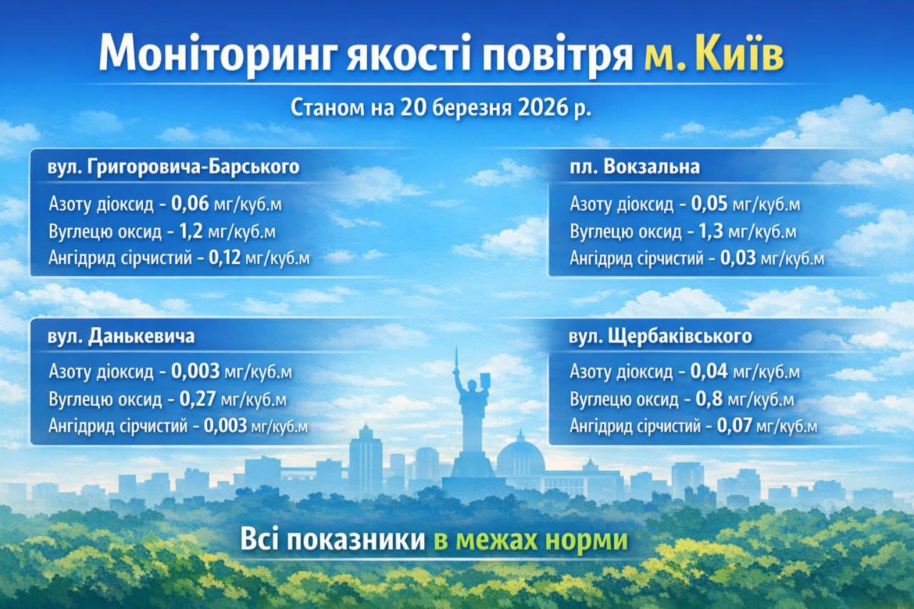 Станом на сьогодні перевищення граничнодопустимих максимально разових концентрацій (ГДК м.р.) шкідливих речовин (діоксид сірки, оксид вуглецю, діоксид азоту) в повітрі м. Києва не реєструвалися.