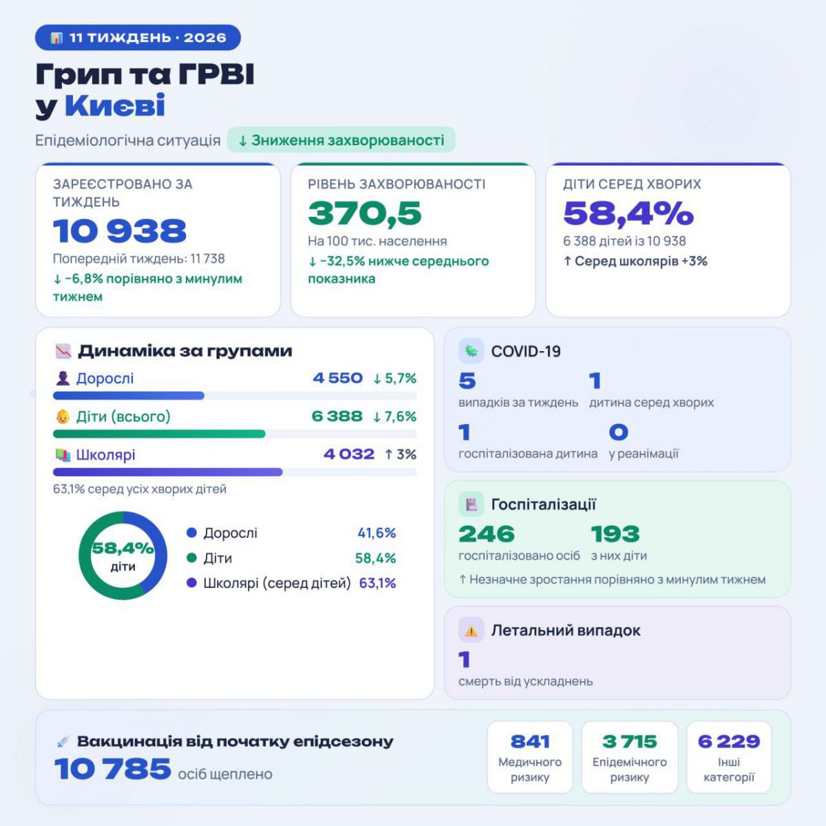 За тиждень зареєстровано 10 938 випадків (попередній тиждень — 11 738).