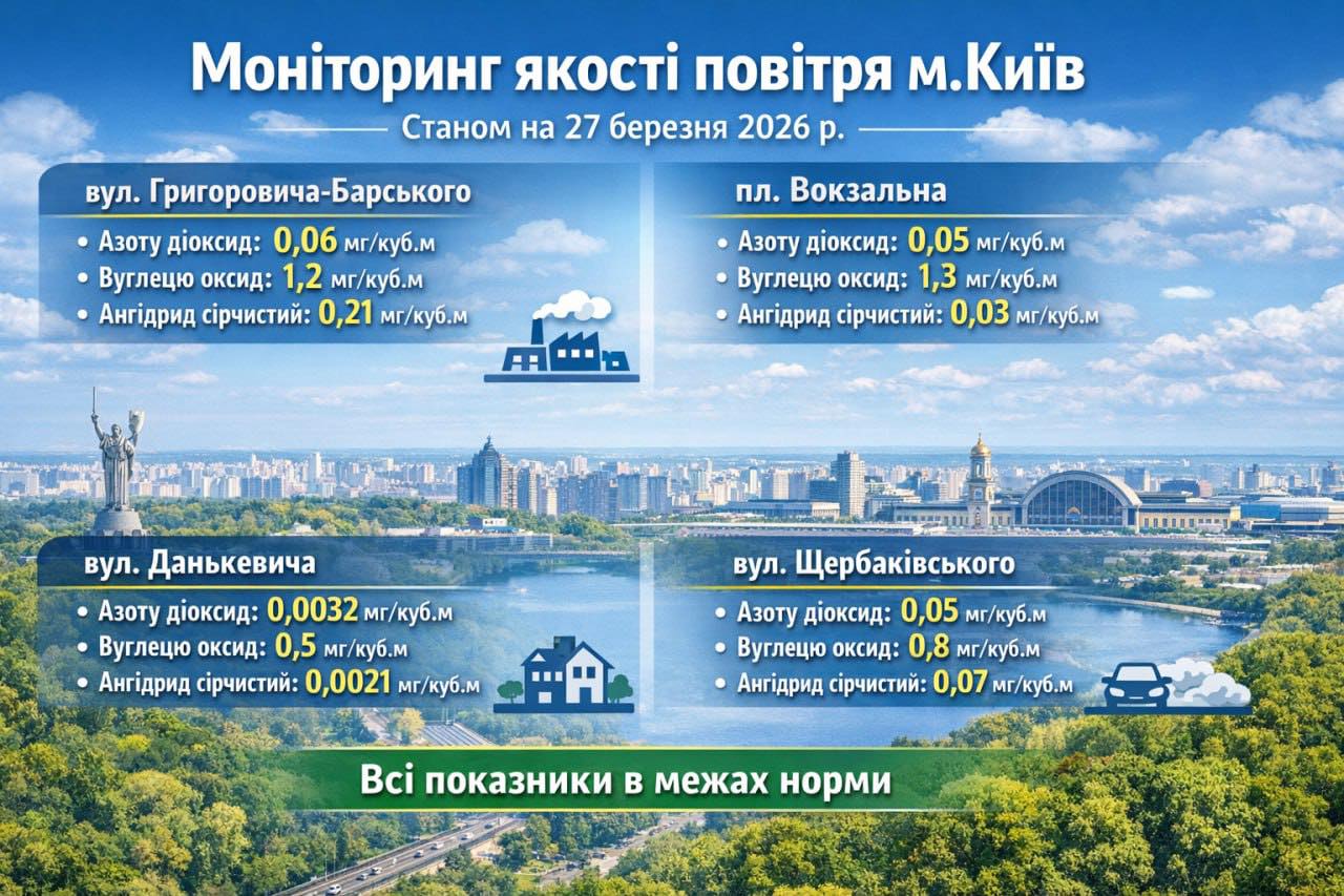 Станом на сьогодні перевищення граничнодопустимих максимально разових концентрацій (ГДК м.р.) шкідливих речовин (діоксид сірки, оксид вуглецю, діоксид азоту) в повітрі м. Києва не реєструвалися.