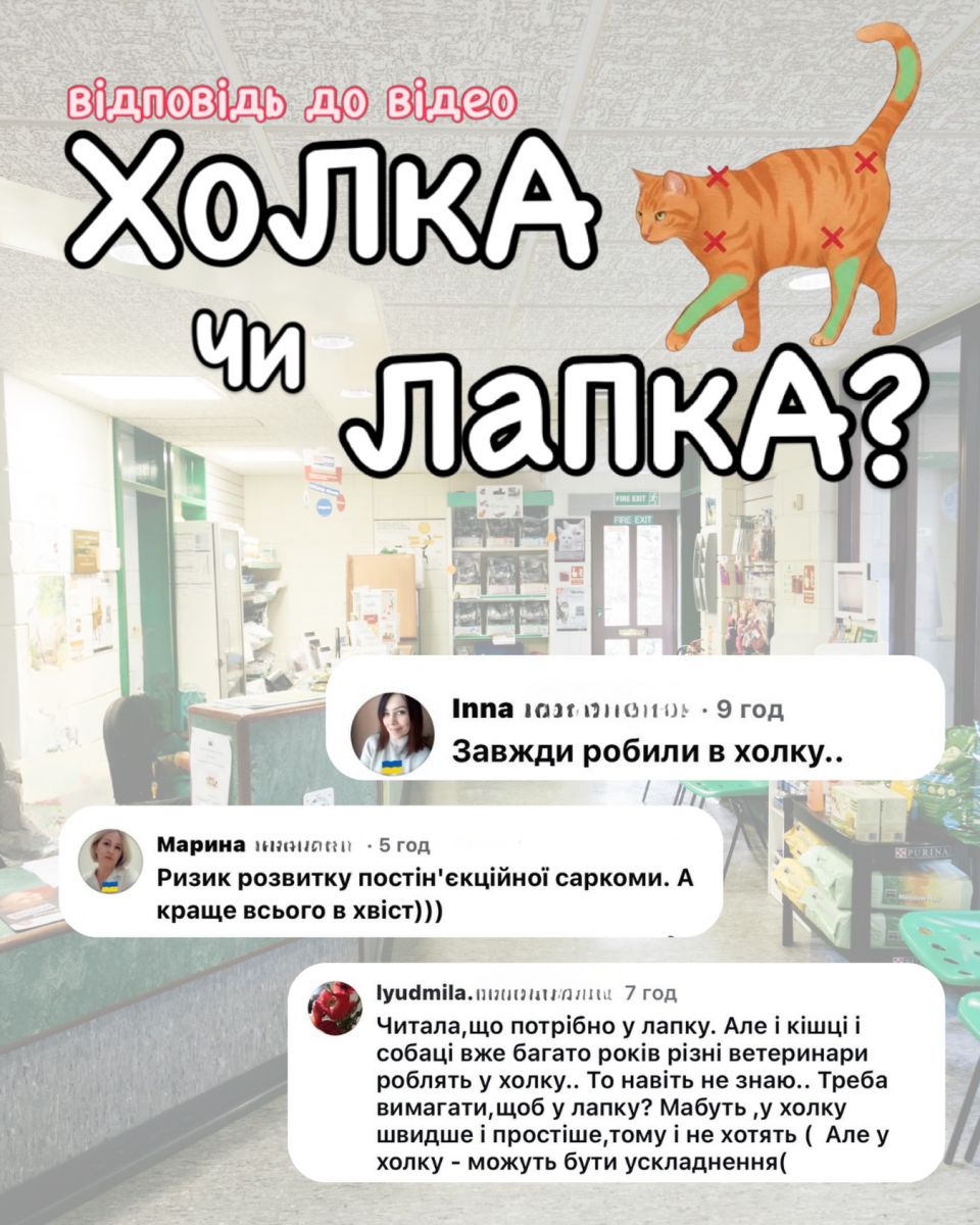 Все дуже просто, є міжнародні рекомендації, які рекомендують котам робити щеплення в ті місця, звідки теоретично легше прибрати ймовірну пухлину. У випадку з холкою, вона може проростати одразу в хребет і в цьому випадку вже нічого не зробиш. Якщо ж використовувати інʼєкцію в лапку, то в гіршому випадку тварина може втратити тільки її. Звучить жорстко, але саме така логіка