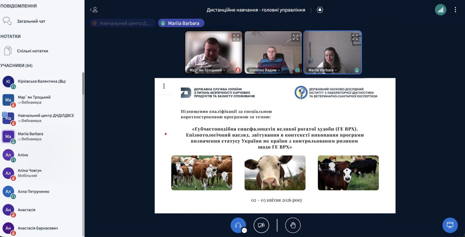02 квітня в Навчальному центрі ДНДІЛДВСЕ розпочалося підвищення кваліфікації за спеціальною короткостроковою програмою на тему: «Губчастоподібна енцефалопатія великої рогатої худоби (ГЕ ВРХ). Епізоотологічний нагляд, звітування та визначення статусу України як країни з контрольованим ризиком щодо ГЕ ВРХ».
