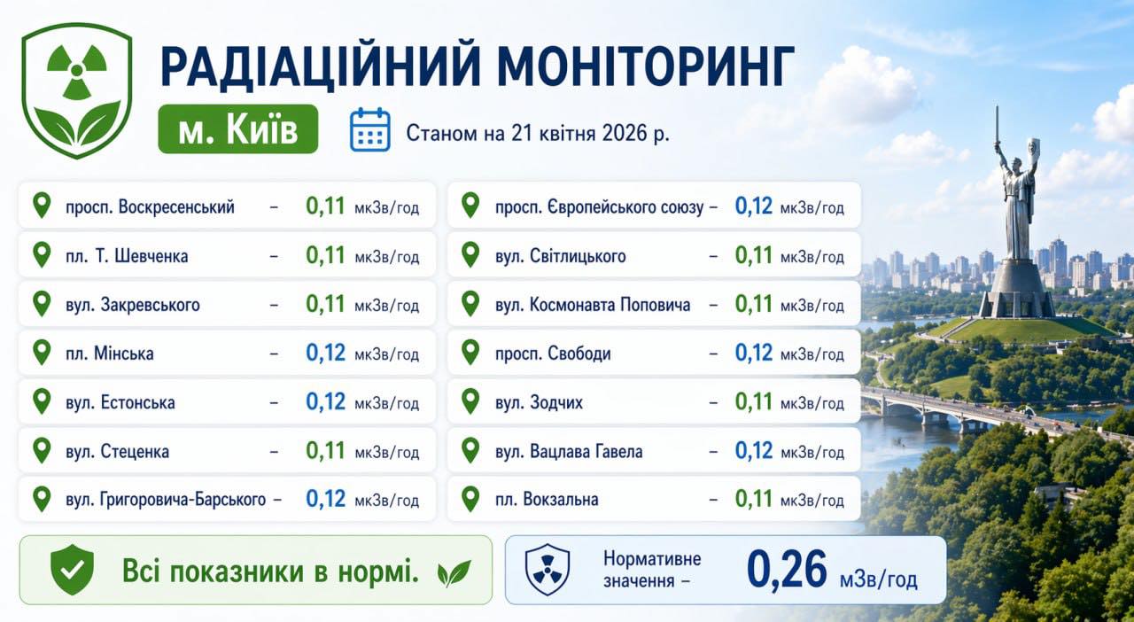 Моніторинг радіаційного фону в м. Києві 21 квітня 2026 року