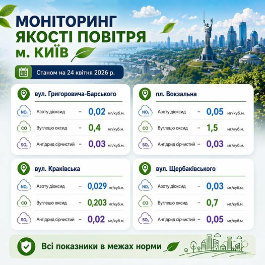 Станом на сьогодні перевищення граничнодопустимих максимально разових концентрацій (ГДК м.р.) шкідливих речовин (діоксид сірки, оксид вуглецю, діоксид азоту) в повітрі м. Києва не реєструвалися.