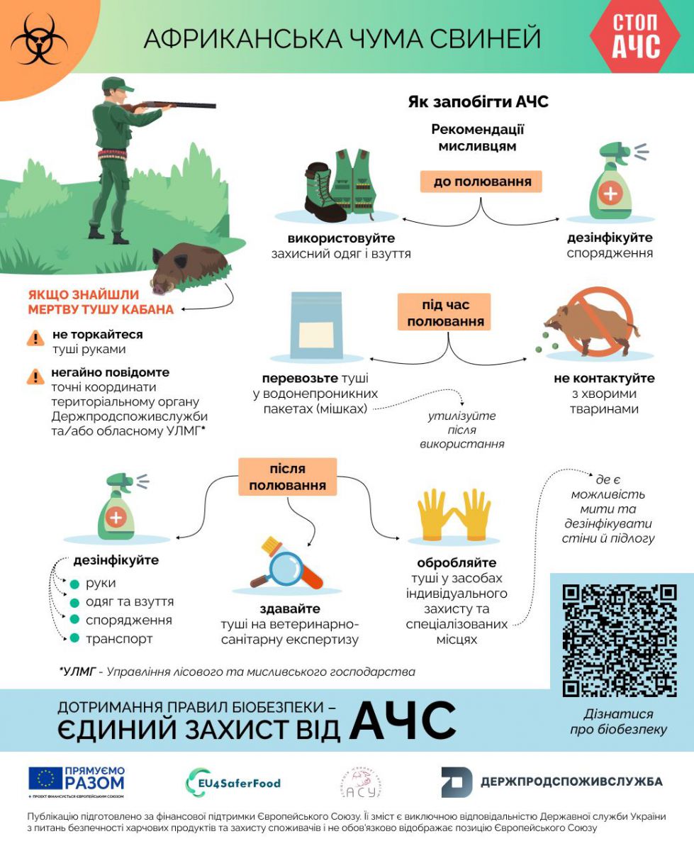 Закликаємо мисливців бути особливо обережними для недопущення потрапляння вірусу АЧС у місця, з яких можливе його поширення на свиногосподарства!