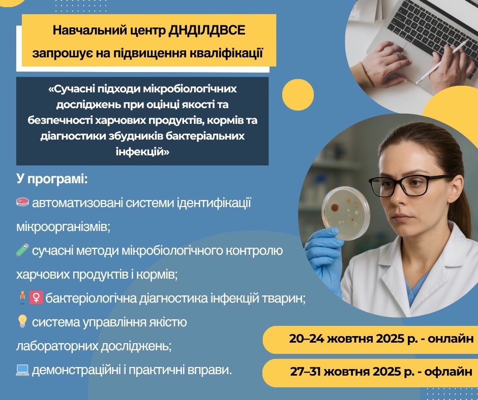 Державний науково-дослідний інститут з лабораторної діагностики та ветеринарно-санітарної експертизи запрошує пройти підвищення кваліфікації за спеціальною довгостроковою програмою на тему: «Сучасні підходи мікробіологічних досліджень при оцінці якості та безпечності харчових продуктів, кормів та діагностики збудників бактеріальних інфекцій згідно сучасних методик та з використанням автоматизованих систем дослідження та ідентифікації мікроорганізмів». Термін дистанційного навчання: 20–24 жовтня 2025 року (онлайн)