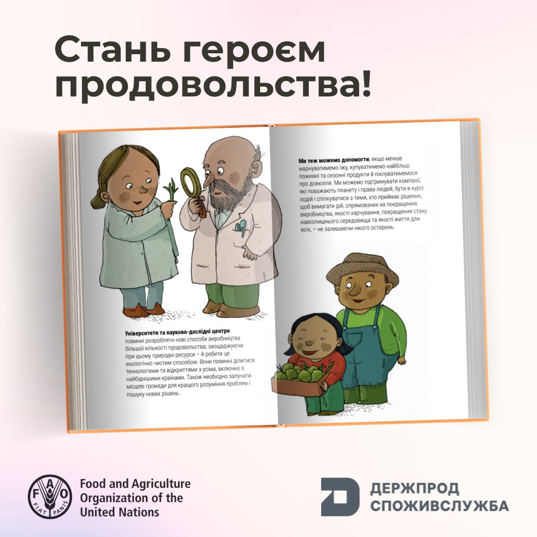 ФАО навчає дітей і підлітків розуміти продовольчі системи: як вирощуються овочі та фрукти , чому важливо берегти воду, підтримувати фермерів і не витрачати зайвого. У книжці «Стань героєм продовольства» організація пояснює ці теми простою мовою, через ігри та завдання.