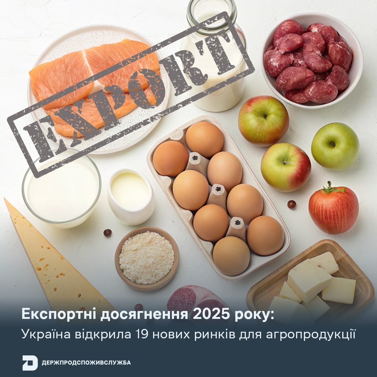 «Диверсифікація ринків збуту української продукції тваринного і рослинного походження є одним із пріоритетних напрямів державної аграрної політики. Упродовж 2025 року завдяки послідовній та злагодженій роботі фахівців Держпродспоживслужби, Міністерства закордонних справ України, Мінекономіки та закордонних дипломатичних установ було відкрито 19 нових ринків для експорту української аграрної продукції», — зазначив Сергій Ткачук, Голова Держпродспоживслужби.