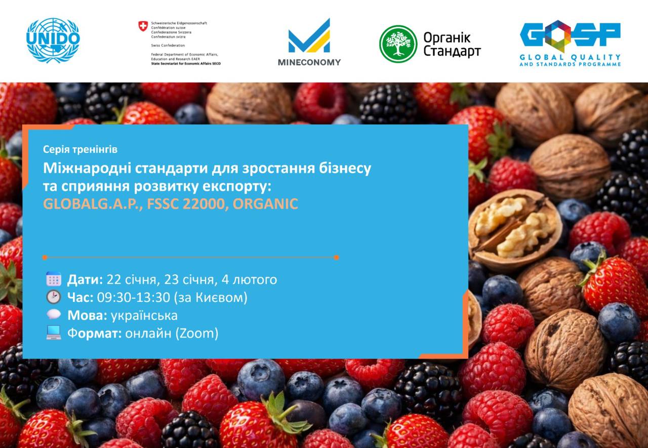 Серія онлайн-тренінгів організована органом сертифікації «Органік Стандарт» за підтримки Швейцарії в межах Глобальної програми якості та стандартів в Україні (GQSP), що впроваджується Організацією Об'єднаних Націй з промислового розвитку (UNIDO).