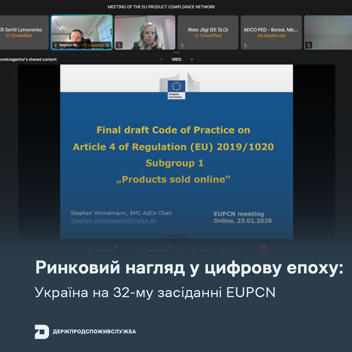 23 січня 2026 року Держпродспоживслужба взяла участь у 32-му засіданні Мережі ЄС з відповідності продукції (EUPCN) в онлайн-форматі. Захід об’єднав експертів ЄС та України для підвищення безпеки товарів і захисту споживачів.