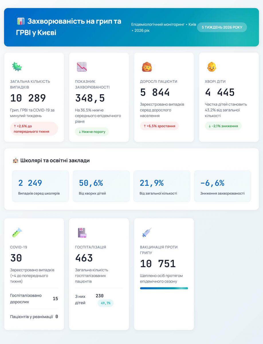 За минулий тиждень у столиці зареєстровано 10 289 випадків грипу, ГРВІ та COVID-19 (тижнем раніше – 10 024).