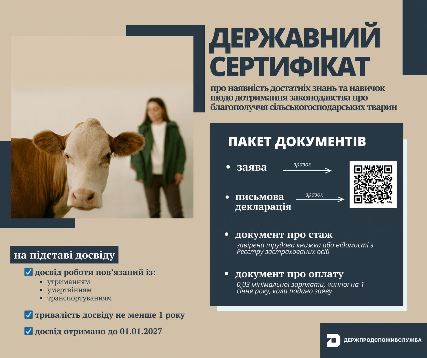 Нагадуємо, що особи з досвідом роботи не менше одного року, набутим до 1 січня 2027 року, можуть отримати сертифікат без проходження спеціального навчання. Досвід враховується за такими видами діяльності, як утримання, транспортування, умертвіння тварин та інші супутні операції.