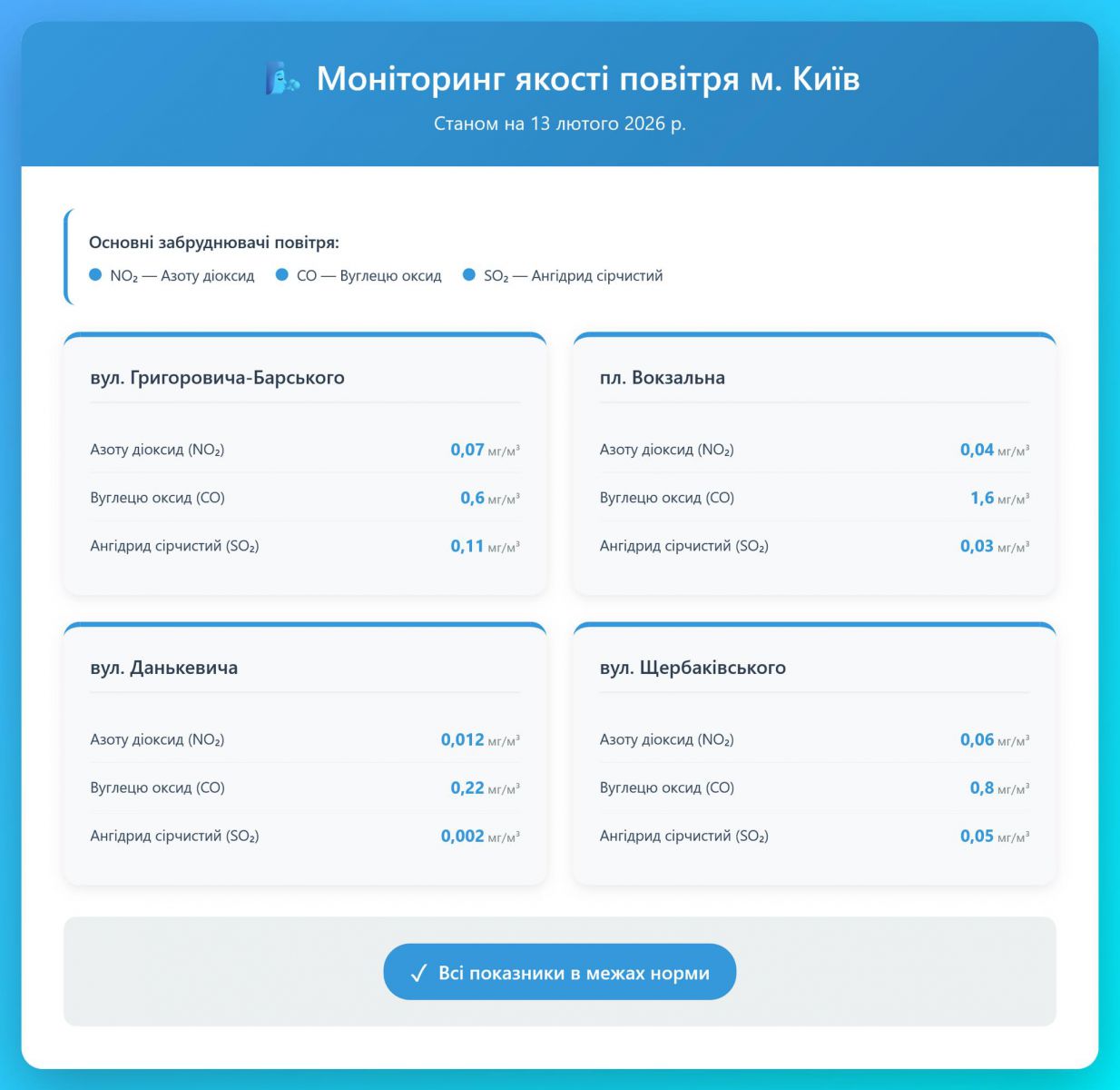 Стан атмосферного повітря в м. Києві 13 лютого 2026 року