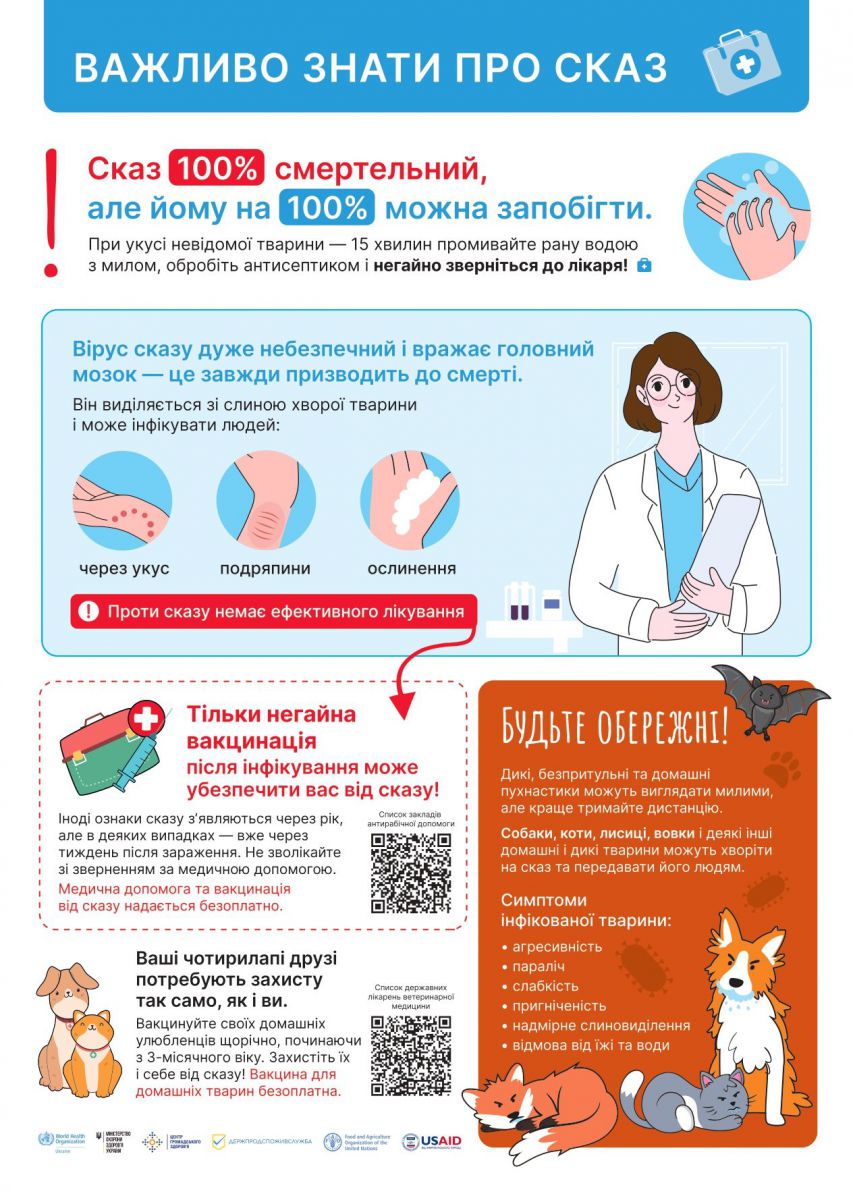 Вірус сказу передається через укус, подряпини або ослинення хворої тварини та вражає головний мозок. Ефективного лікування не існує — лише негайна вакцинація після контакту може врятувати життя.