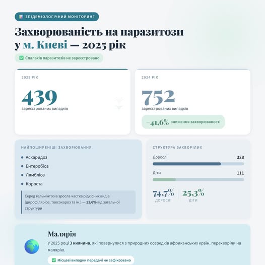 У Київ у 2025 році зареєстровано 439 випадків паразитарних хвороб, тоді як у 2024 році — 752 випадки.