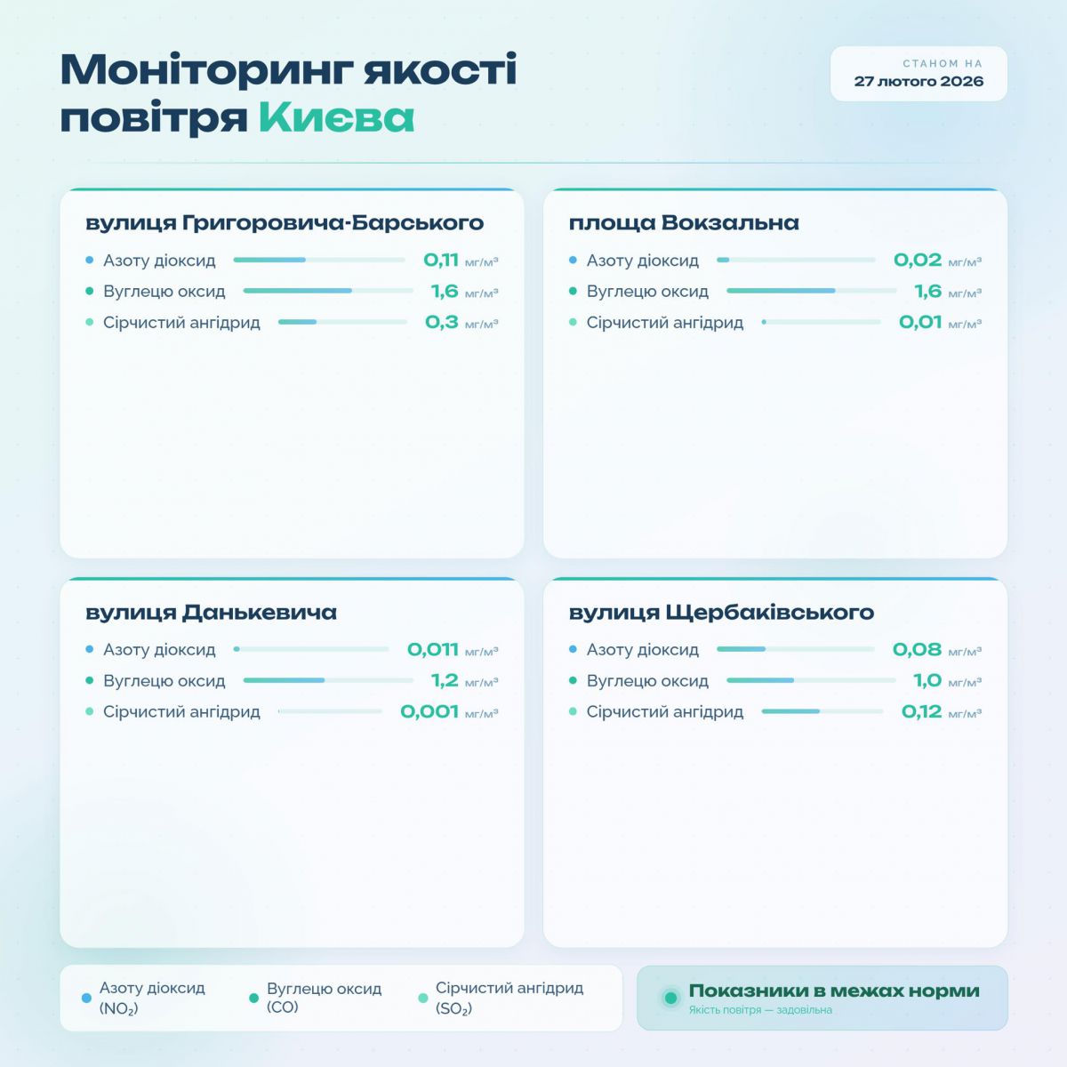 Станом на сьогодні перевищення граничнодопустимих максимально разових концентрацій (ГДК м.р.) шкідливих речовин (діоксид сірки, оксид вуглецю, діоксид азоту) в повітрі м. Києва не реєструвалися.