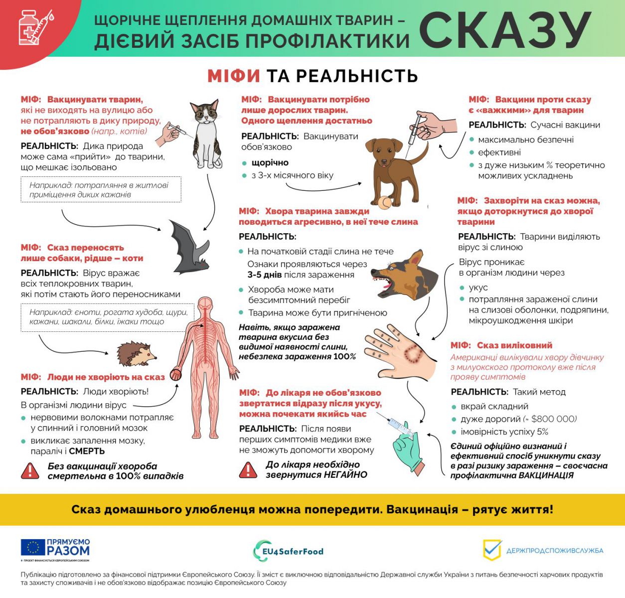 Правда замість міфів про сказ: попри доступність інформації, навколо сказу досі поширюються хибні уявлення. Дехто вважає, що ризик стосується лише безпритульних тварин, інші, що домашнім улюбленцям без вигулу щеплення не потрібне або що вакцинація «шкодить» здоров’ю тварини.