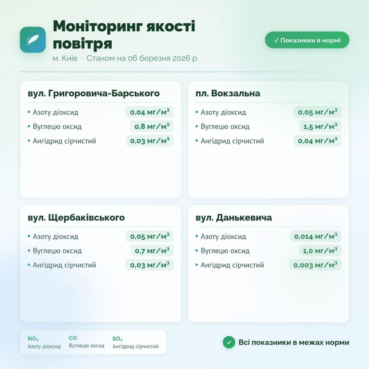 Станом на сьогодні перевищення граничнодопустимих максимально разових концентрацій (ГДК м.р.) шкідливих речовин (діоксид сірки, оксид вуглецю, діоксид азоту) в повітрі м. Києва не реєструвалися.