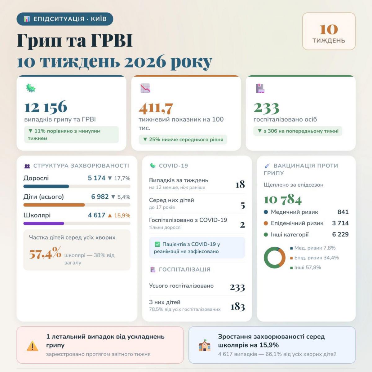 За звітний тиждень у м. Києві зареєстровано 12 156 випадків захворювання на грип та ГРВІ, зокрема COVID-19 (на попередньому тижні — 13 664).