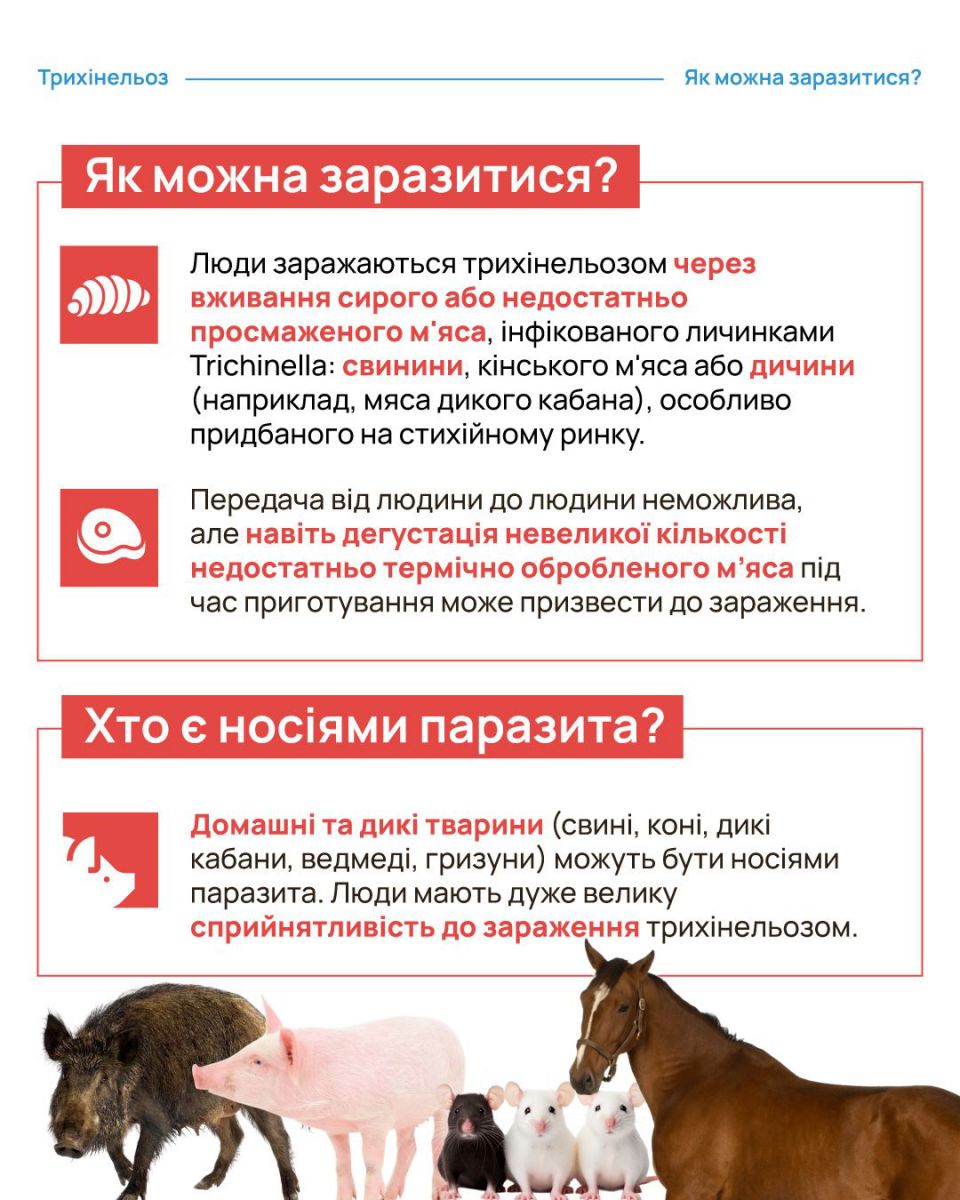 Реалізація та споживання м’яса свиней або мисливської дичини допускається лише після проведення лабораторного дослідження на трихінельоз.